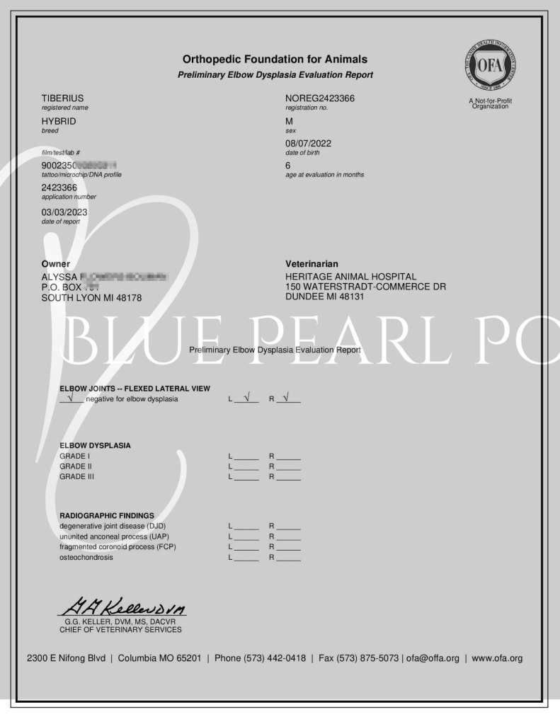 Sire: “Ty” Tiberius Asbjörn, Embark Clear, OFA Vision Exam PASS/Registration Complete, OFA Elbows&Hips PASS/Registration Complete – Scroll down for OFA certificates. We supply x-rays of Elbows & Hips upon request.